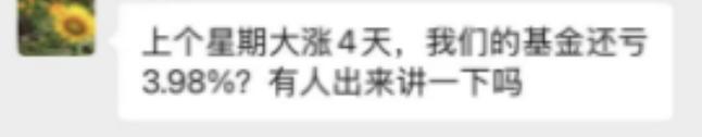 虽然如此,但仍有不少基金还在亏损。一位投资者发出灵魂拷问:" 上个星期大涨 4 天,我们的基金还亏 3.98%?有人出来讲一下吗?"