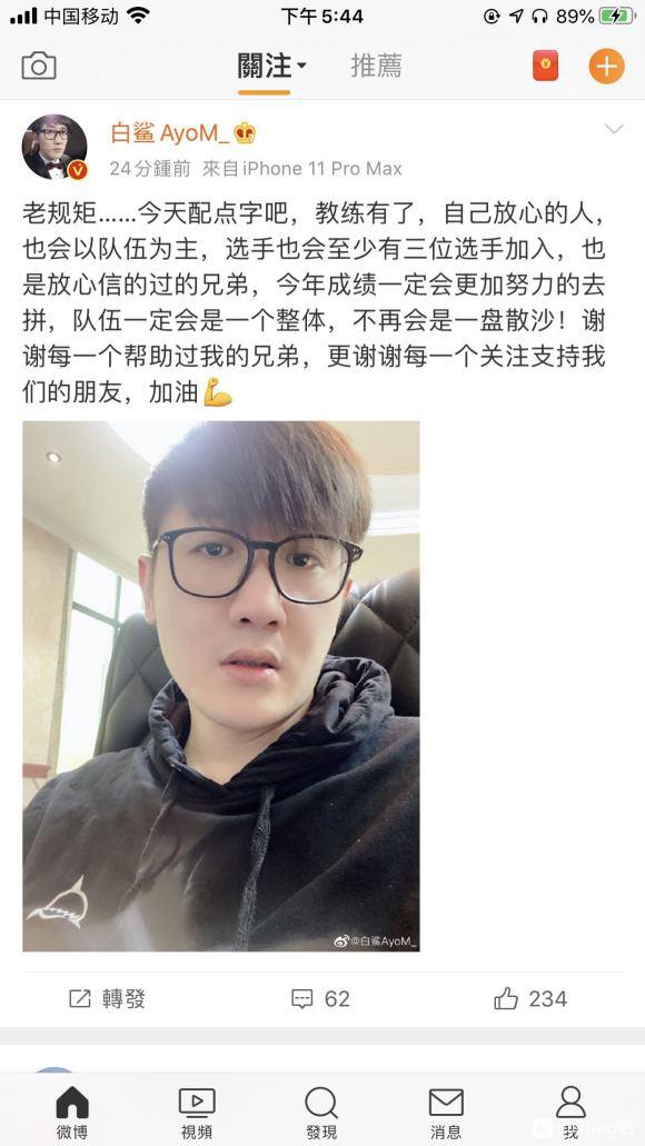 先来看下白鲨的微博原文:老规矩,今天配点字吧,教练有了,自己放心的人,也会以队伍为主,选手也会至少有三位选手加入,也是放心信得过的兄弟,今年成绩一定会更加努力的去拼,队伍一定会是一个整体,不再会是一盘散沙!谢谢每一个帮助过我的兄弟,更谢谢每一个关注支持我们的朋友,加油。