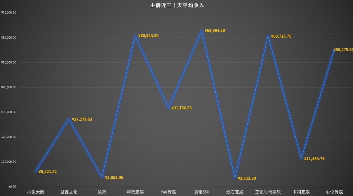 以活跃主播为基数,近三十天内各大公会主播人均收入从三千到六万元不等,主播量更多的小象、渝万、炫石等处于收入曲线的低谷处。而嗨玩、舞帝、正恒时代等三家公会均实现主播平均月收入破六万元,处于曲线制高点。