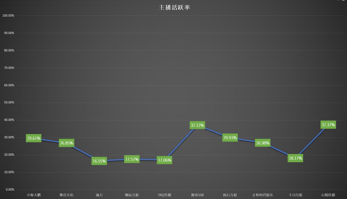 旗下收录主播量过万的情况下,小象大鹅与炫石两家的主播活跃率还能够保持在近30%,相当出挑。而旗下坐拥主播数处于十大公会之最的渝万,活跃率却是最末,仅为16%。