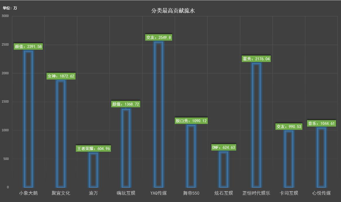 十家公会旗下在各大分类最高贡献流水中,普遍以泛娱乐分区作为主要火力输出点。其中YAQ、卡司娱乐今年在交友版块的流水表现不俗,主要流水也是依靠于这个分区。事实上,交友分类相比于音乐、舞蹈等分类,交友厅对主播才艺要求低,并且几乎不需要露脸用到摄像头,开播成本更低,多人主播同屏互动带来更多爆点,不用担心与为了节目效果与其它主播连麦互动导致被分流。