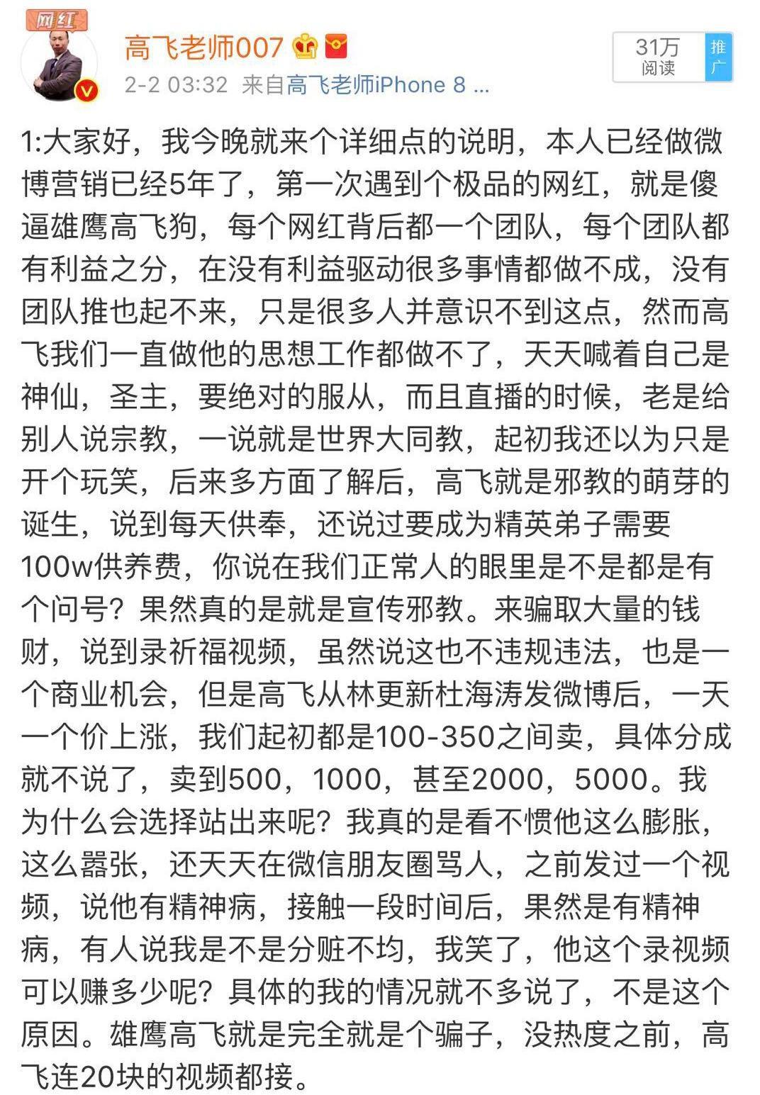 2月2日,微博搞笑自媒体“高飞老师007”突然发消息,指认雄鹰高飞本人是邪教头子,并成立反高飞联盟,企图呼吁更多人参与反高飞斗争。而发文的人不用多说,自然是雄鹰高飞背后的团队。