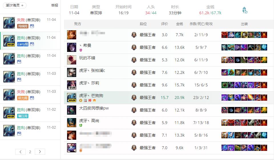 随着登顶国服,最近芒果鱼也是决定给自己放松一下,会通过小号打钻石局。虽然钻石局在普通玩家眼中是很高的段位,但在芒果鱼眼里这个分段则是教学局,比如下方这场钻石局芒果鱼的鱼人便是打出了25击杀带领队友取胜!除了小鱼人外,芒果鱼的刺客型英雄以及常规法师英雄也玩得不错,比如薇古丝,有兴趣的玩家可以在虎牙观看芒果鱼直播教学。
