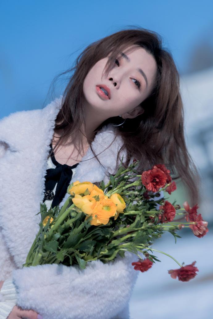 照片中,殷桃身处雪地,穿着白色毛绒外套手捧鲜花,头发微卷散落在肩头,在白雪皑皑中沐浴阳光,魅力十足。