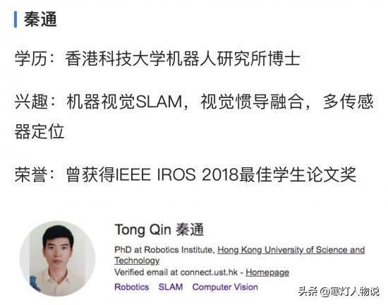 在大四开学的第一天,秦通被香港科技大学录取硕博连读,此后进入机器人研究所攻读博士,师从沈劭劼教授。其研究主要包括机器视觉SLAM,视觉惯导融合,多传感器定位。在IEEE TRO、ICRA、IROS、ECCV等国际顶级期刊和会议发表多篇论文,获得IEEE IROS 2018最佳学生论文奖。