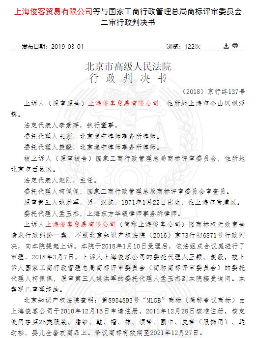 据中国裁判文书网发布的《上海俊客贸易有限公司等与国家工商行政管理总局商标评审委员会二审行政判决书》显示,上诉人上海俊客贸易有限公司因商标权无效宣告请求行政纠纷一案,不服北京知识产权法院行政判决,向北京高院提起上诉。