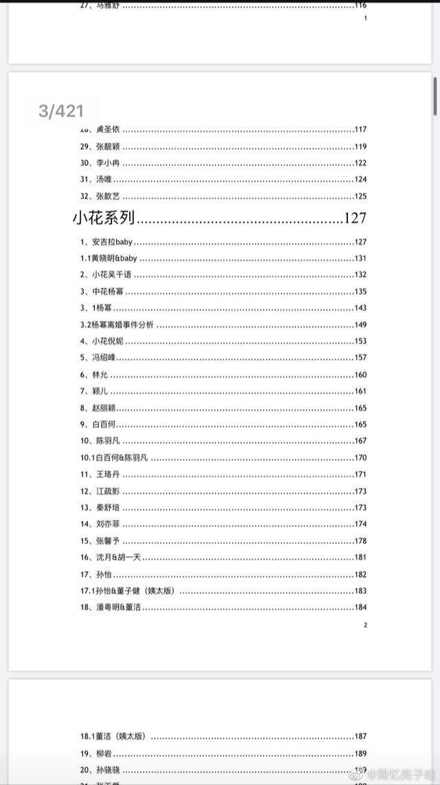不久前在热搜传的娱乐圈421是一个相关深扒娱乐圈各种各样安全事故的或是深受提出质疑的一线明星的各种各样瓜的一篇贴近420页的娱乐圈的八卦,421是以PDF方法呈现给大家的,这也是偏爱八卦吃瓜人民群众的褔利,421整体的分类十分的全,关于公会产品系列的,四旦双冰、老家伙产品系列、惯三产品系列、湾湾男明星女明星、花朵产品系列这种各种各样瓜被深扒。