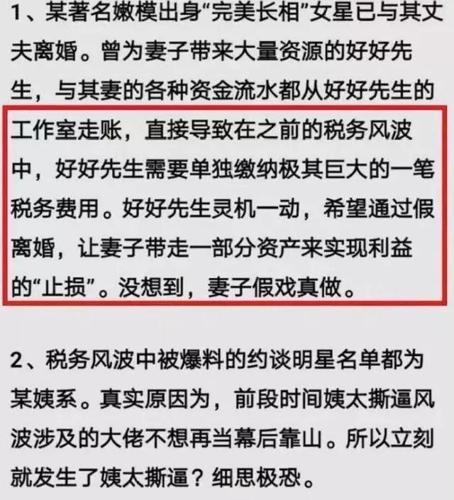 某著名嫩模出身"完美长相”女星已与其文夫离婚。曾为妻子带来大量资源的好好先生,与其妻的各种资金流水都从好好先生的工作室走账,直接导致在之前的税务风波中,好好先生需要单独繳纳极其巨大的一笔税务费用。好好先生灵机一动,希望通过假离婚,让妻子带走一部分资产来实现利益的“止损”。没想到,妻子假戏真做。