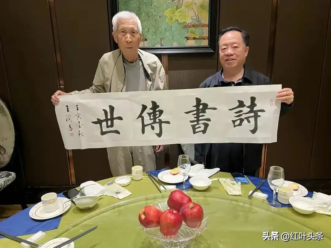王润昌(右)向贾锡信先生敬赠书法条幅
