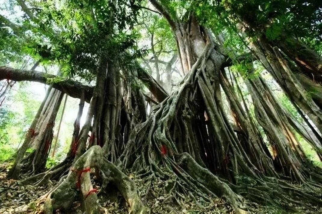 首先,绞杀植物的幼苗附生于“支柱植物”上,长出气生的网状根系包围树干并向下扩展,直到伸入地下生成正常根系。从土壤中吸收养分后生长加快,网状根膨大并愈合为网状茎,支柱植物则被绞杀致死。