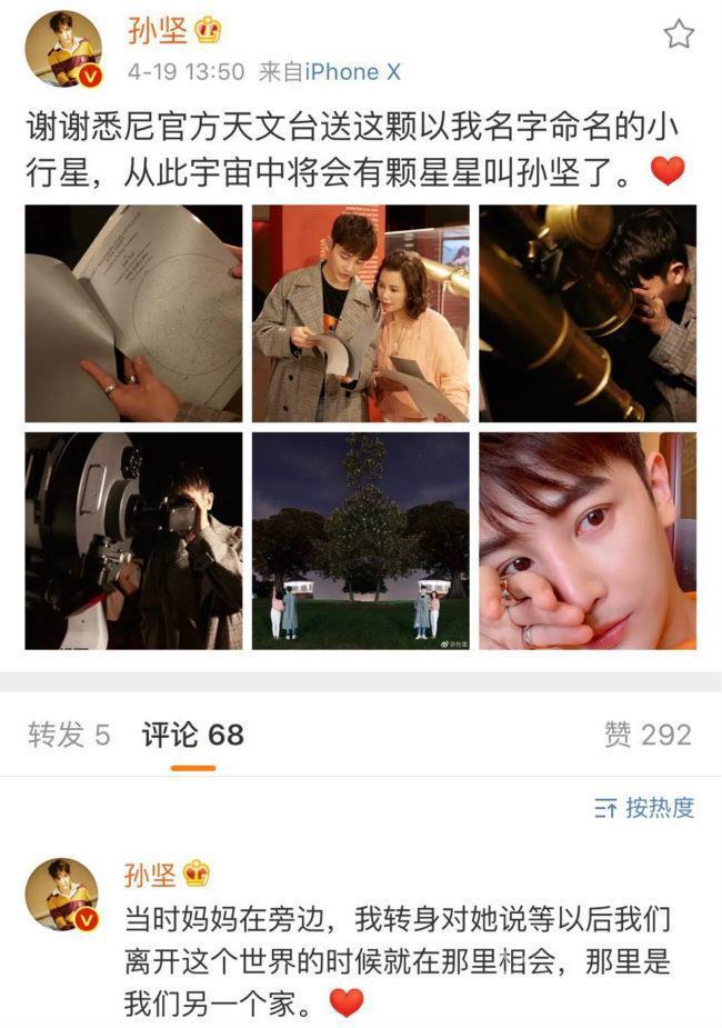 虽然,此次孙坚获小行星命名值得恭喜,但是也有网友表示:这并不是多大的事,不是可以花钱买么?之前就有粉丝花钱买了送偶像的啊!