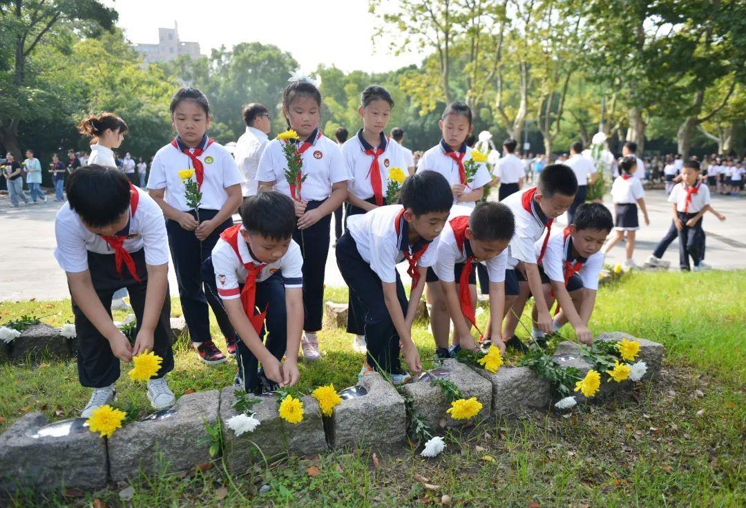 上午9时18分,在上海淞沪抗战纪念馆胜利广场,纪念仪式在国歌声中正式开始。参加仪式的学生代表共同撞响“警世钟”,14响钟声响彻宝山上空,代表着中华民族14年抗战的艰苦历程,提醒大家铭记历史,勿忘国耻。随后,各界代表在无名英雄纪念碑前向抗战先烈敬献鲜花,共同缅怀在14年抗战中英勇牺牲的英烈和不幸遇难的同胞。来自企事业单位、社区居民、学校师生等社会各界代表参与活动,大家一一为牺牲者献花,缅怀英烈,寄托哀思。