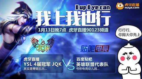 S6即将开启,虎牙直播将联合百度贴吧,为大家奉献一场颠覆传统理念,革新战场规则,重新定义英雄联盟最强玩法的挑战赛。1月13日晚7点,荣获YSL 4届冠军的JQK将代表虎牙直播,摆出3万元的奖励,接受百度贴吧——LOL吧、竞技游戏吧代表队的挑战!高手往往隐藏在民间,4届YSL冠军JQK会否在网友面前人财两失,身败名裂?1月13日晚7点,锁定虎牙直播!
