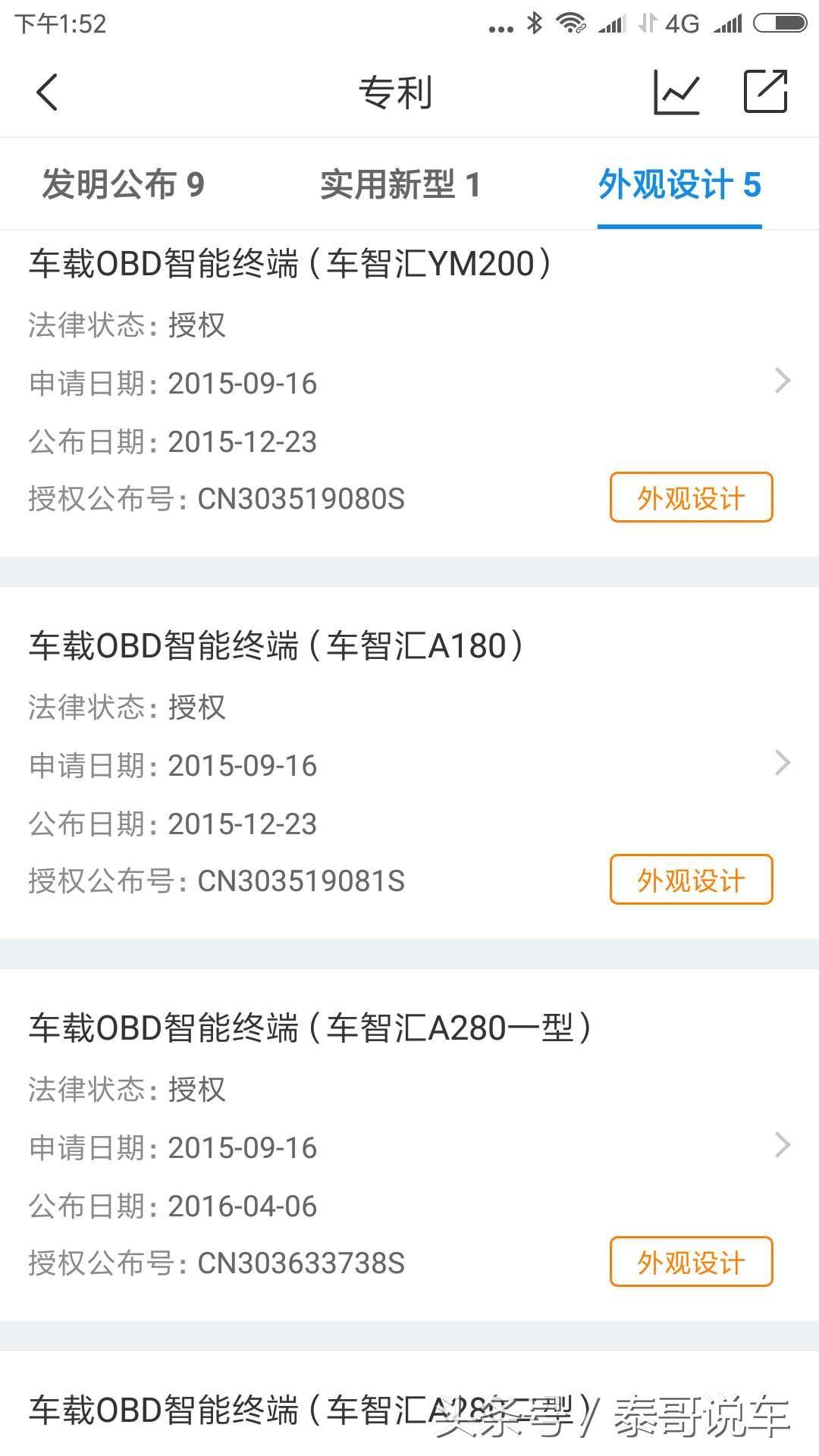 第二,他们的所谓核心技术的OBD的盒子,这个东西大家到淘宝上搜索一下,二三百块一个,很普通的一个东西,一样能实现很多功能,卖1431是不是贵了点,然后他们所谓专利,大多是外观专利: