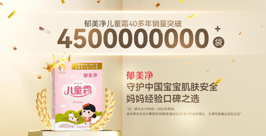 郁美净品牌创建于1979年,至今已经有44年的历史了,其秉承着“以呵护宝宝健康为己任”这一核心价值观,以科技创新引领企业发展,成功打造出中国儿童护肤行业的代表品牌。值得一提的是,袋装郁美净儿童霜自1990年到2022年期间,销量突破45亿+袋。