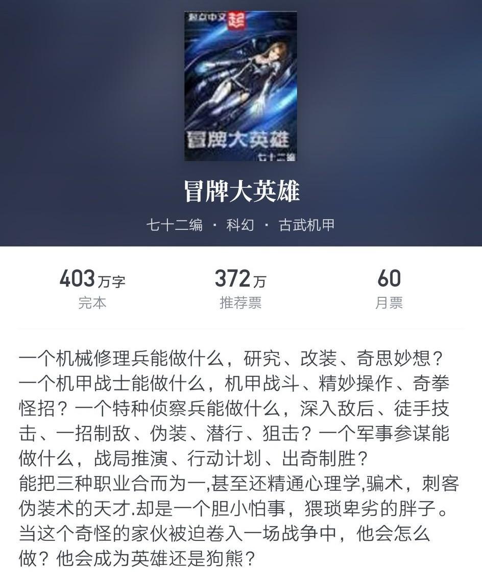 七十二编,在十多年前就凭借《冒牌大英雄》,火遍全网读者,并且一书封神!可以说老书虫们没有几个没读过这本小说的!在当时他的《冒牌大英雄》更新速度就令人担忧,充分体现了什么叫三天两更。