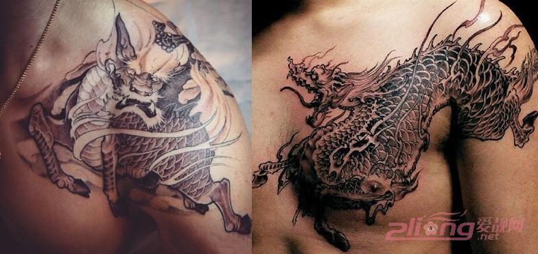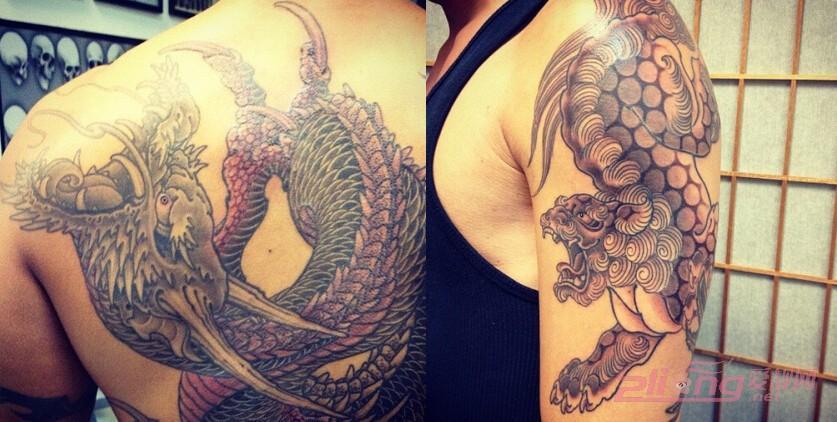 这两款麒麟纹身最大的共同特点就是,着重了对麒麟尾巴的雕刻。麟甲横生的细微特点让纹身师傅精心地描绘在背部和臂弯处,让人更想一探究竟,不舍得移开目光。
