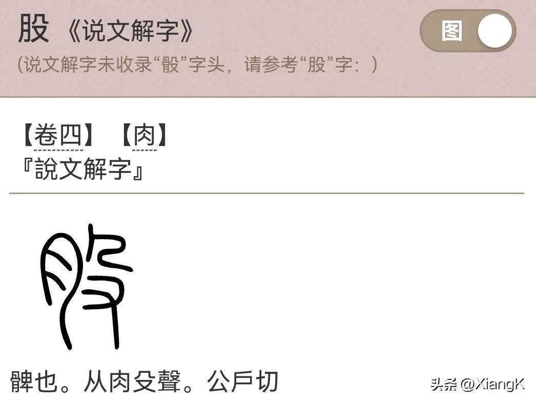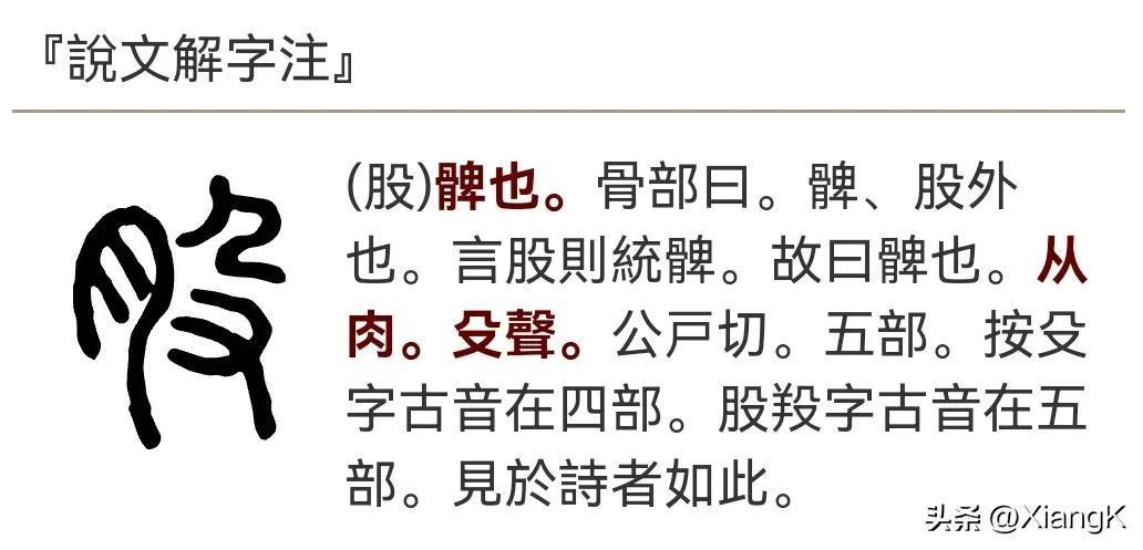 『說文解字注』(股)髀也。骨部曰。髀、股外也。言股則統髀。故曰髀也。