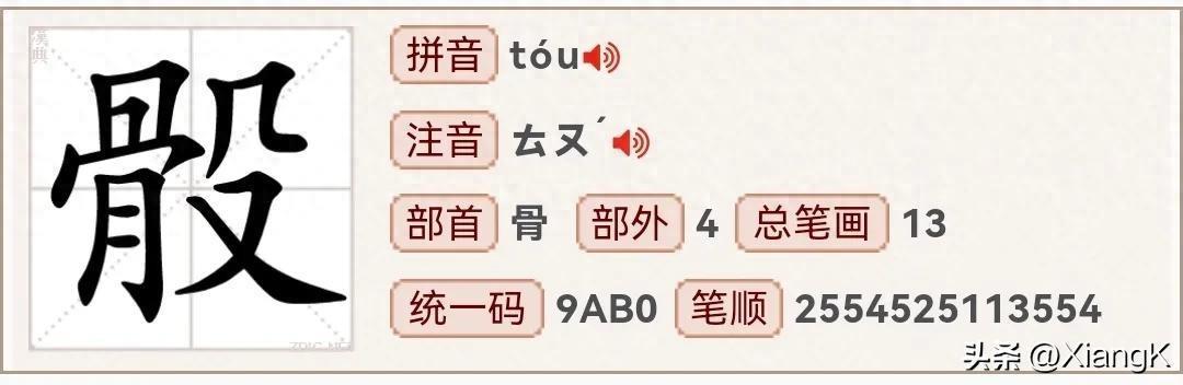 读音:【tóu】、同音字:头、部首为骨、总笔画12、左右结构