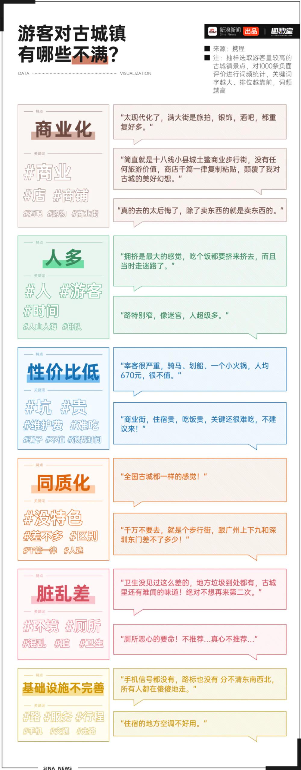 不过这样的旅游项目,游客满意度显然不会高。图数室对几个热门古城镇景区的 1000 条负面评价做了抽样统计,发现大家的不满普遍集中在以下几方面:古镇游很难体验到古朴、静谧的历史原貌,取而代之的是杂货商铺、拥挤的人群、脏乱差的环境等。