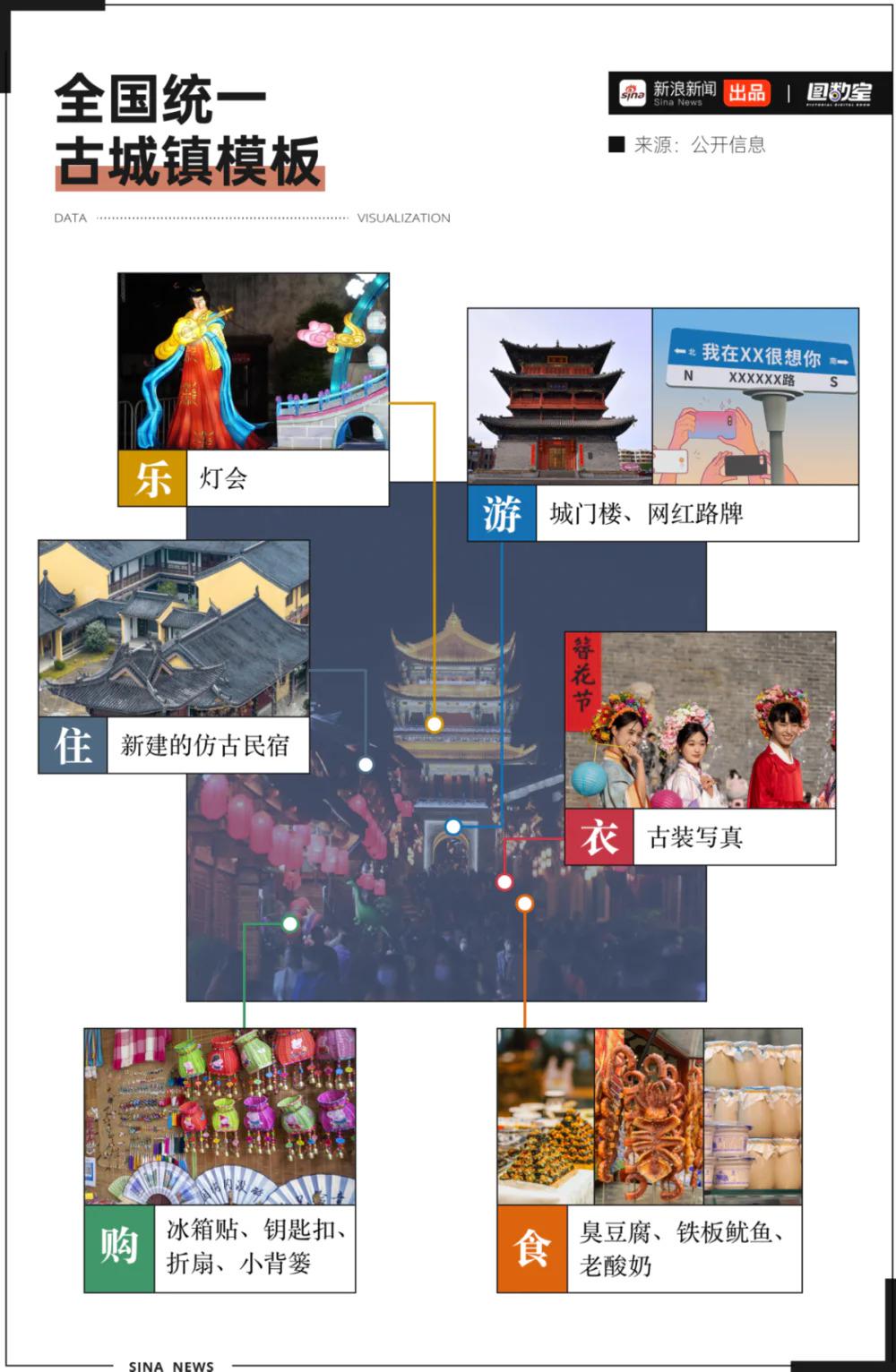 从古北水镇到平遥古城,从乌镇到丽江古城,无论去哪个网红古城镇玩,你大概率都能吃到臭豆腐烤鱿鱼老酸奶 " 三件套 ",站在新建的古建筑前,对着 " 我在 XX 很想你 " 的路标,穿古装打卡拍照。