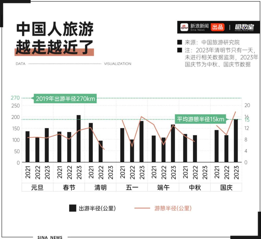 据中国旅游研究院数据,2019 年,中国游客假期出游半径为 270 公里,到了 2023 年人们出游反而走得更近了,平均基本不超 200 公里。