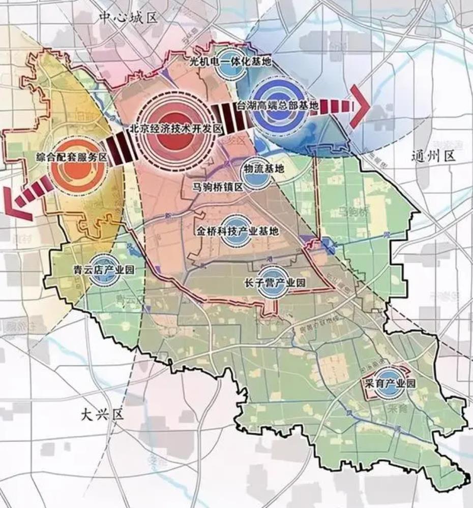 亦庄新城(大兴部分)形成北京经济技术开发区配套服务板块,包括亦庄镇、旧官镇、瀛海镇、青云店镇、长子营镇、采育镇,未来在存量产业用地优化升级、促进职住平衡等方面提升;