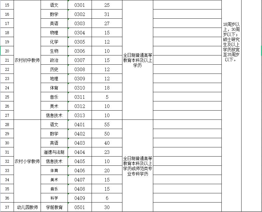 报考普通高中、农村初中及农村小学教师的应具有与报考职位层次(学段)、专业(学科)相应的教师资格证,幼儿园教师应具有幼儿园教师资格证。具有高学段教师资格的,可报考同专业低学段。符合专业的中等职业学校教师资格与高中可互相通用。