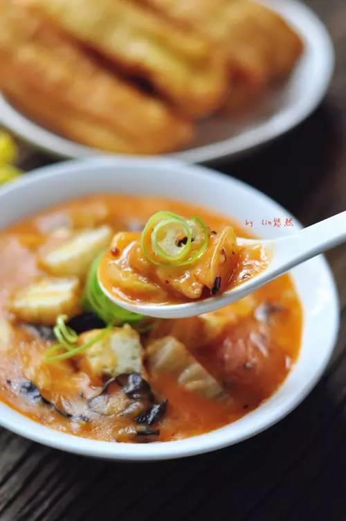 材料:面粉80g、干木耳5g、娃娃菜50g、开水560g、大葱半根、大蒜4瓣、盐、五香粉、鸡精、油泼辣子各适量