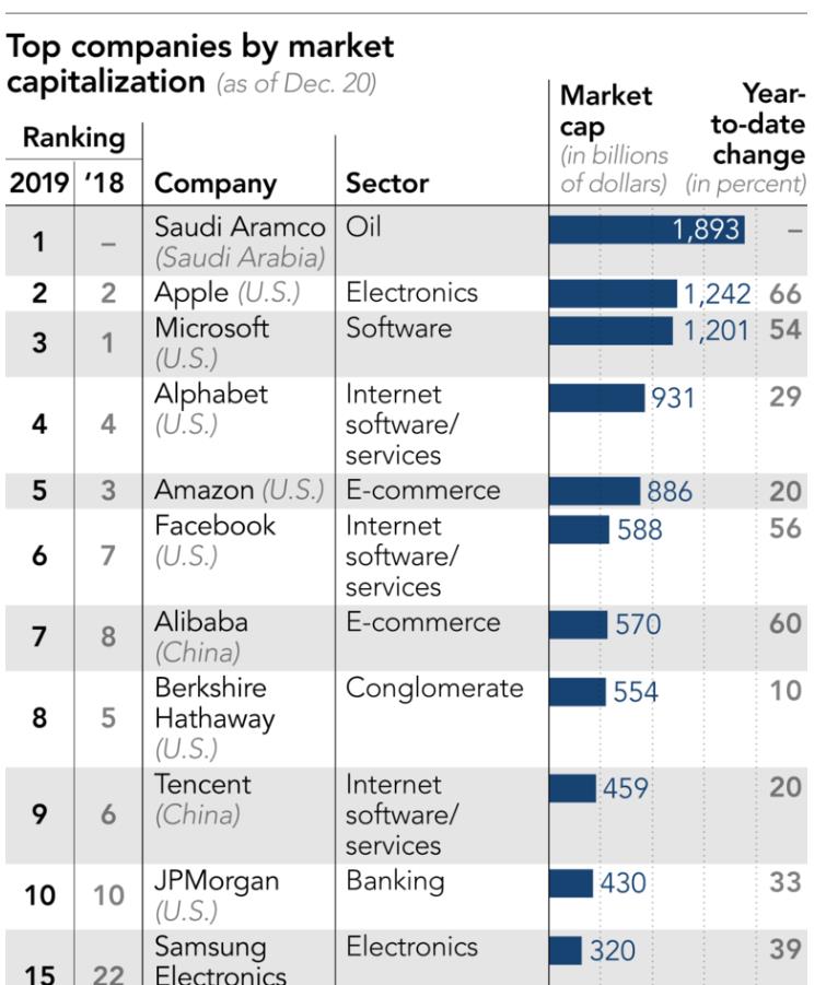 近日,《日经亚洲评论》编制了一份截至2019年12月20日的亚洲以及全球公司的市值榜单,并与他们在2018年年底的市值进行了对比。根据该对比图,我们能够了解到,全球公司中,科技公司占据了榜单前十中的七个席位。