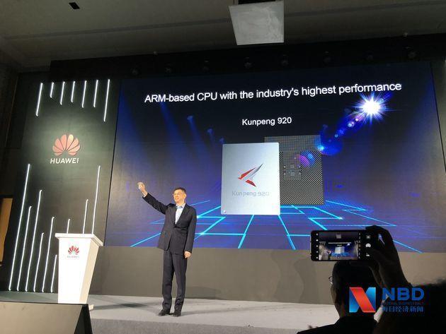 华为董事、战略Marketing总裁徐文伟手拿鲲鹏920芯片进行展示 图片来源:每经记者 王晶 摄