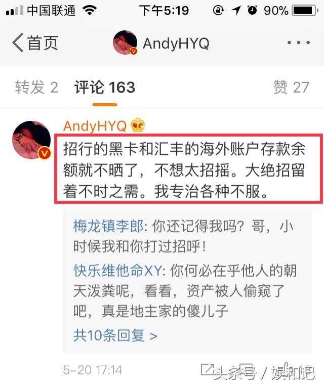 而黄毅清随后还补充到:招行的黑卡和汇丰的海外账户存款余额就不晒了,不想太招摇。大绝招留着不时之需。我专治各种不服。