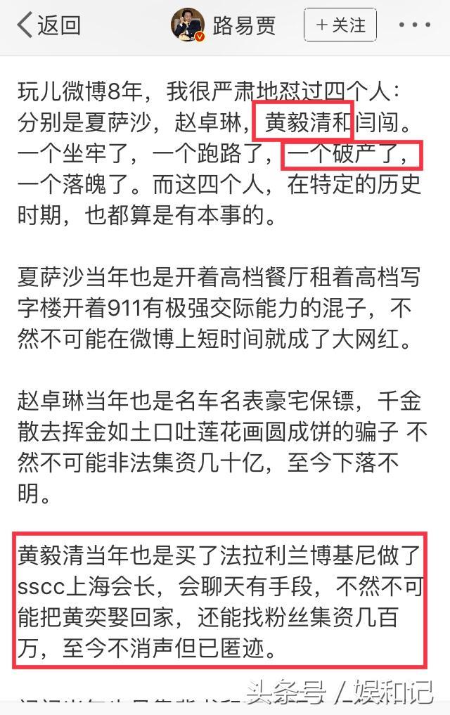 5月20日,一位名叫“路易贾”的微博大V发文称,玩微博8年自己很严肃的怼过4个人,其中一个就包括黄毅清。并说黄毅清已经破产了,现在虽然没有消声但已匿迹。