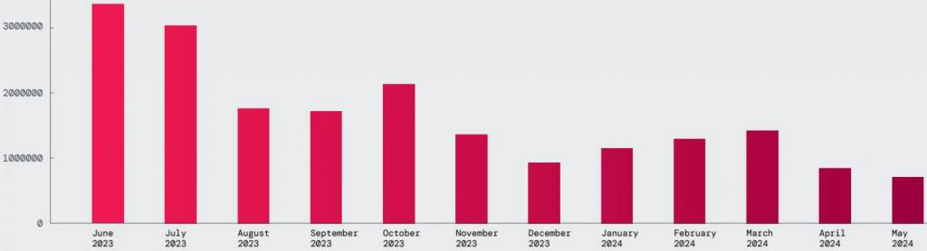 就今年阻止的恶意软件而言,Zscaler 报告称,通过阻止交易来衡量,趋势显示整体下降。