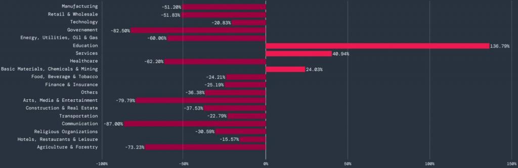 报告显示,移动恶意软件主要针对教育行业,该行业被阻止的交易量增加了 136.8%。服务业增长 40.9%,化工和采矿业增长 24%。所有其他行业均出现普遍下滑。