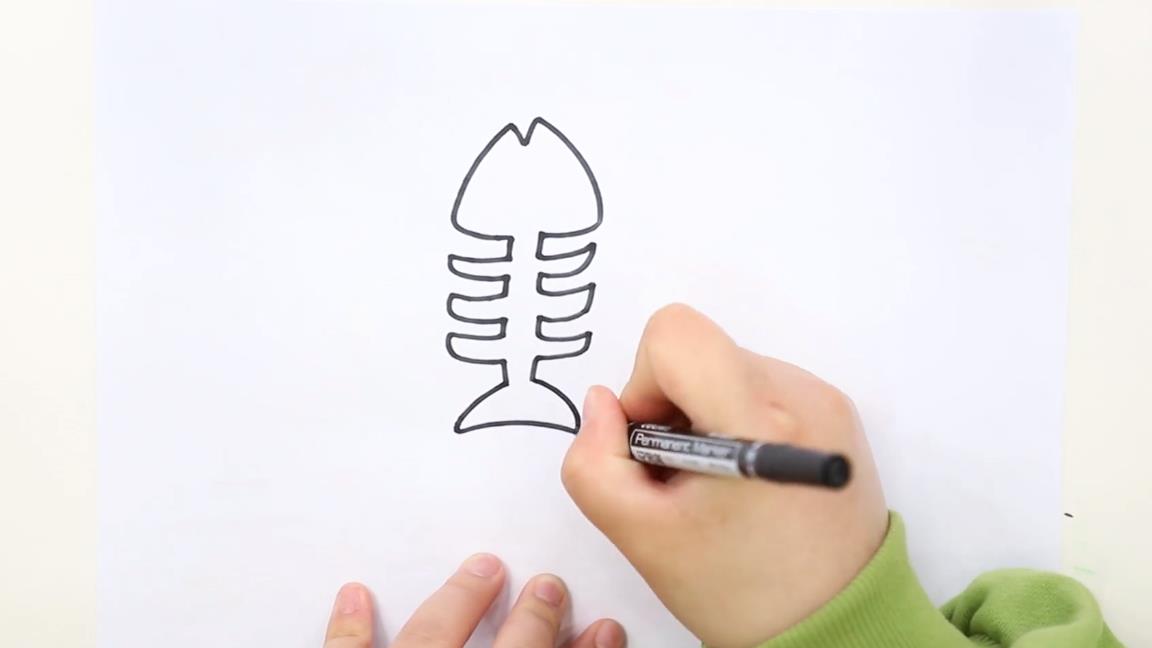 鱼骨头:步骤①先用折线画出鱼骨的头部,接着画出锯齿状的脊骨和扇形尾骨;