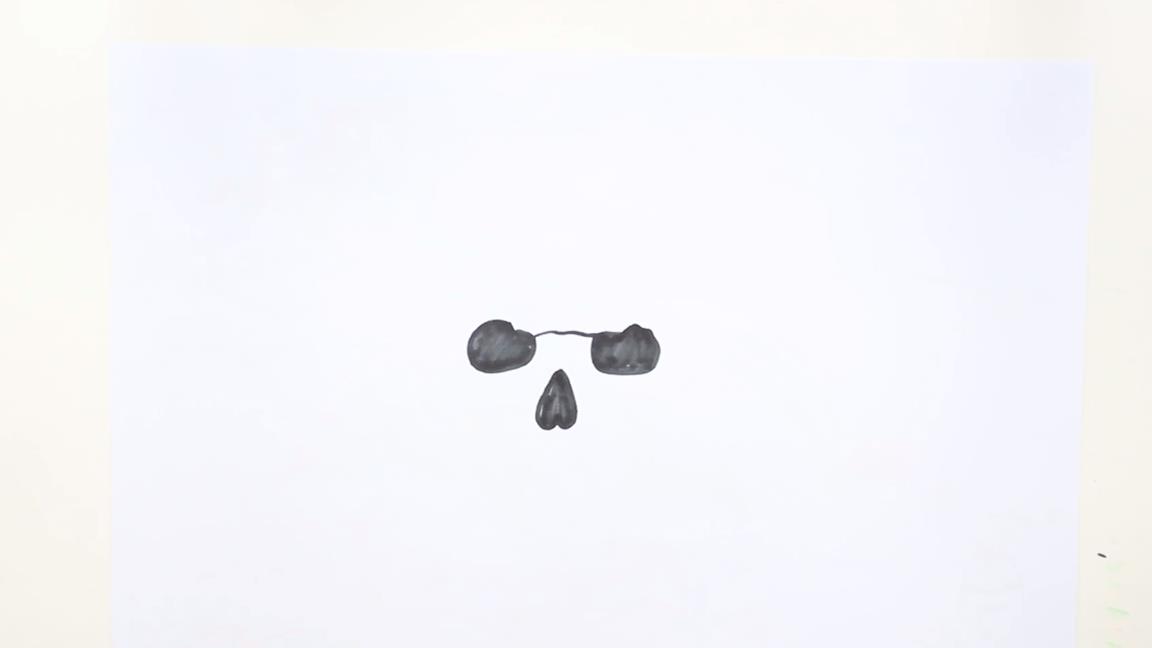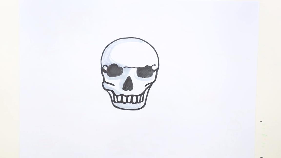 人类头骨:步骤①先用椭圆和横线画眼眶,画出倒心形鼻骨,将眼眶和鼻骨涂黑;
