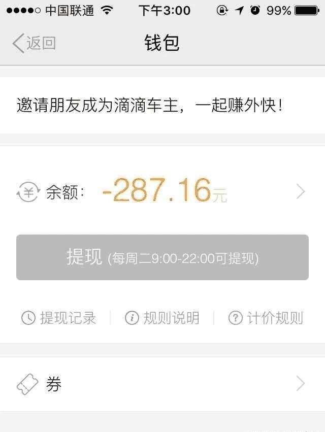 2016年上半年小陈有跑过几单滴滴,后来8月份就没跑了钱也退出来了。最近查看APP 发现欠了滴滴287块钱。这是怎么回事一头雾水。 打电话问客服说是9月份的一个订单违约扣款。 9月份这不扯淡吗?