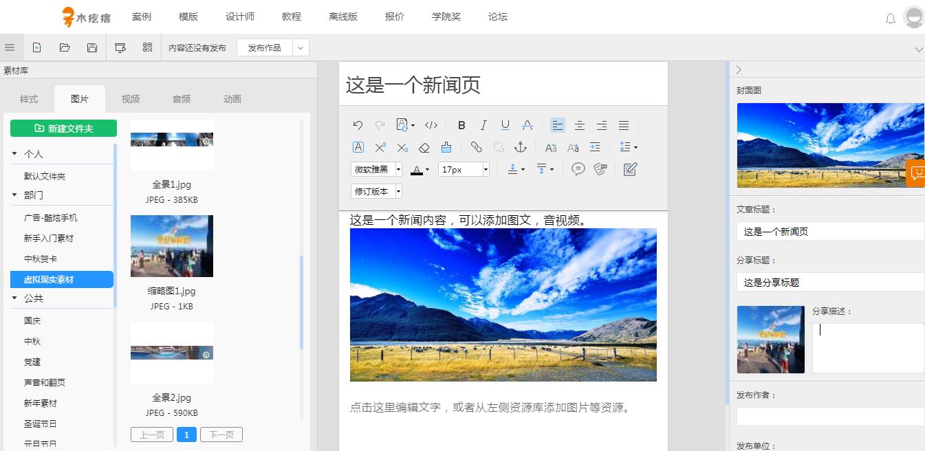 提供了图文、H5、图片、视频、数据图表等完整的内容创作工具套件。