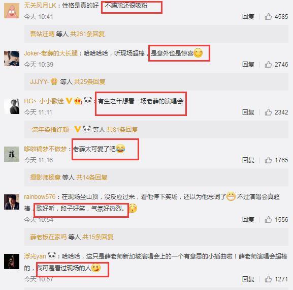 “说了你可能不信,我特么被一个饱嗝吸粉了”“他本来打算继续唱当没事发生的 可是我们都在笑 搞到他也笑场了”“只是一个小插曲了,整场氛围真的超棒!”“演唱会是真好听,段子也很搞笑,但各种意外神奇的笑点真的是很多呀”“听现场超棒,是意外也是惊喜”