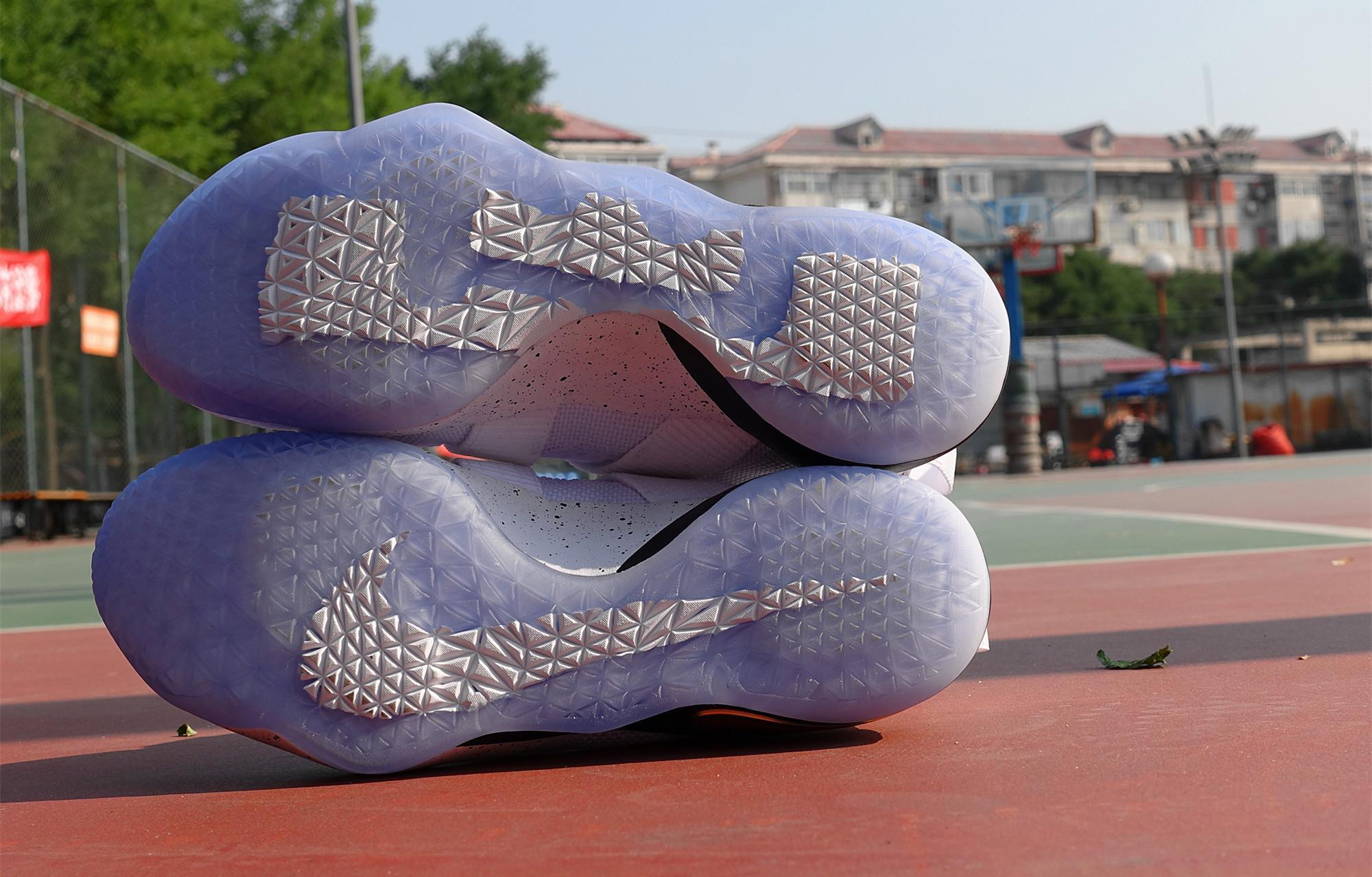 中底缓震方面依然采用前后ZOOM AIR气垫,透过水晶外底即可直观的看到。大底纹路采用三角形的切割碎块,排列非常密集。