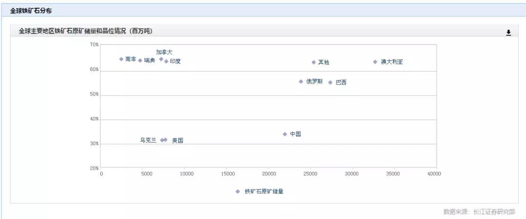 全球铁矿石原矿储量按2012年口径统计,总共为1700亿吨,分布地区较为集中,澳大利亚、巴西、俄罗斯和中国是最大的铁矿石原矿储量国,四国占全球原矿总储量的66%。澳大利亚和巴西为主要矿石出口国家。全球主要的铁矿石生产商主要有必和必拓、力拓、淡水河谷和FMG公司。