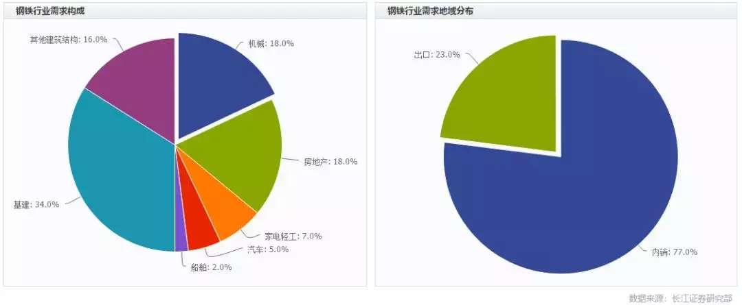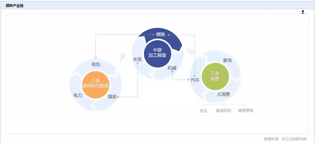 钢铁行业是重要的中游行业,上游原料以铁矿石为主,而下游行业中机械和房地产需求较大。整条产业链的传导作用自下而上,即下游需求影响钢铁产量,进而影响对于上游原料的需求。