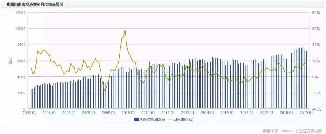 2013年以来我国月度粗钢消费量增速稳定在10%左右,高于产量增速7%。
