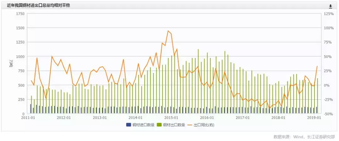 下图是我国钢铁进出口量情况,从图表可以看出,我国钢铁进口量基本持平,而出口量虽呈现周期性波动但整体依然平稳。