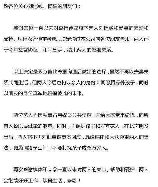 杨幂和刘恺威自结婚以来,每隔一段时间就会传出离婚的消息。12月20日更有人八卦地说,明天会有杨幂宣布离婚的确切消息。但是12月21日杨幂工作室还宣布,此为假新闻。没想到,12月22日就官宣承认两人已签署协议,和平分手,结束婚姻关系,并表示会以亲人的身份共同照顾抚养孩子。