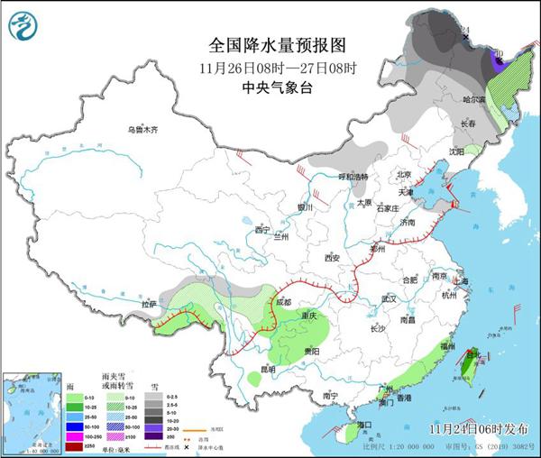 后天(26 日), 内蒙古东北部、黑龙江、吉林东部、山东半岛北部等地部分地区有中到大雪或雨夹雪,其中,内蒙古东北部、黑龙江北部等地部分地区有暴雪,黑龙江北部局地有大暴雪到特大暴雪。西藏东南部、四川南部、重庆南部、贵州西部、云南东部、 福建东南部、 广东东南部、海南岛、台湾岛等地部分地区有小到中雨。