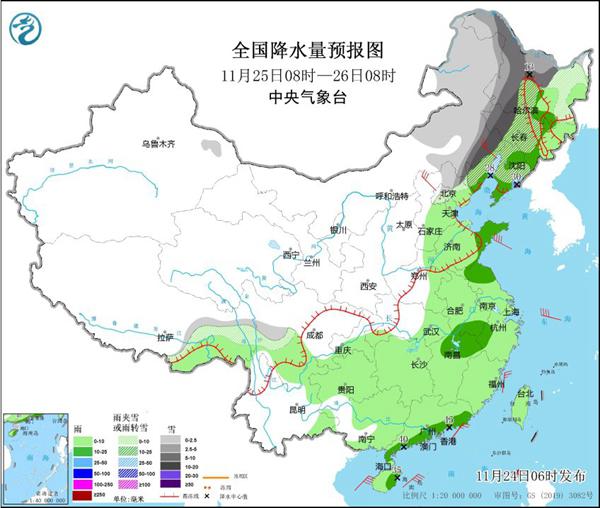 明后天(25 日至 26 日),西北地区雨雪消退,东北地区将成为降雪重心,局地有大暴雪甚至特大暴雪。预计,明天(25 日),内蒙古东部、东北地区中西部、北京东部、川西高原南部等地部分地区有小到中雪或雨夹雪,其中,内蒙古东南部、黑龙江中西部、吉林西部等地部分地区有大到暴雪。辽宁南部、吉林南部、黑龙江南部、山东东部、江苏北部、安徽南部、江西北部、浙江西部、广东南部沿海、海南岛东部等地部分地区有中到大雨。