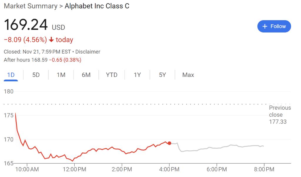 昨日,谷歌 C 跌超 4%,现报 169.24 美元 / 股。