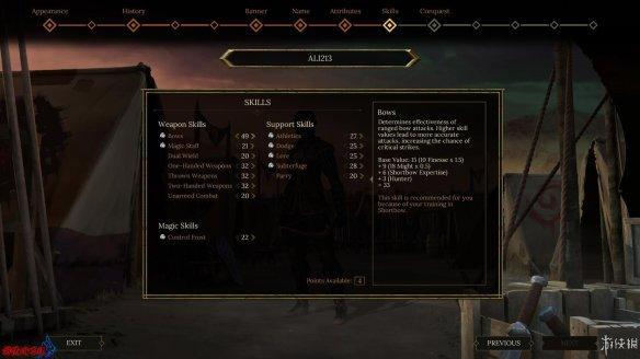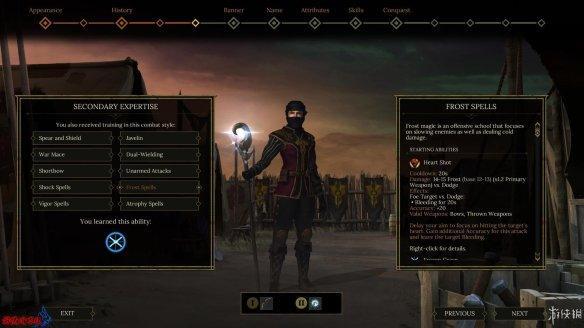 4.主要专长,决定角色战斗风格,依次为:剑与盾、标枪、巨剑、双持武器、短弓、赤手空拳、闪电法术、冰霜法术、生命法术、衰弱法术。